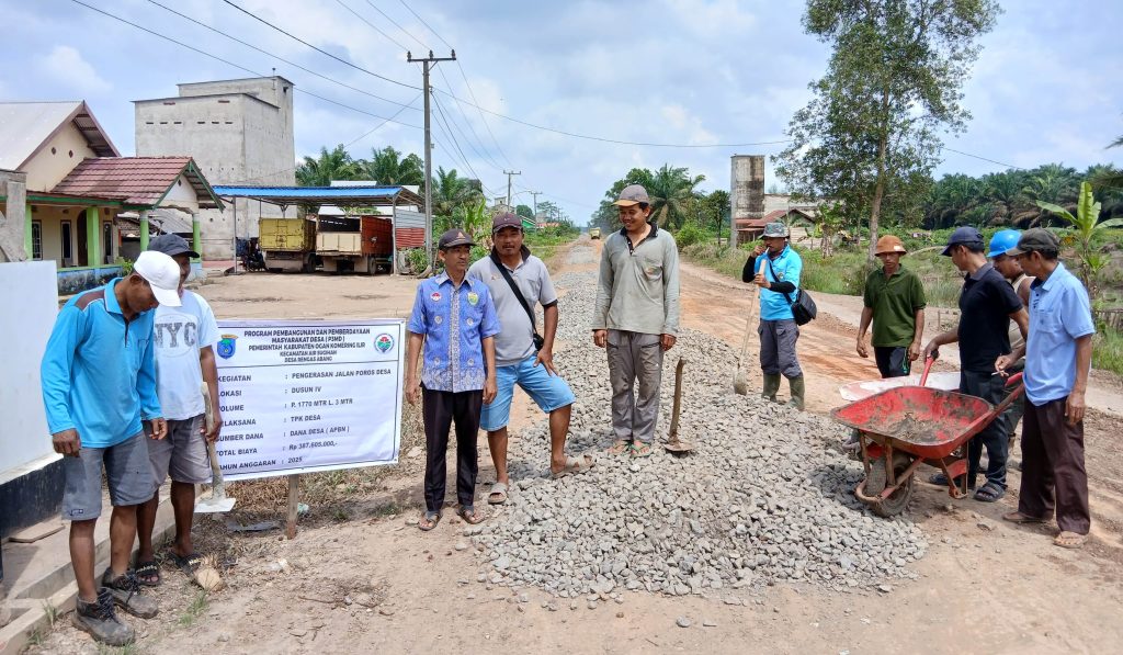 Pada hari yang cerah, warga Desa Rengas Abang bergotong-royong melaksanakan kegiatan serak koral di jalan poros desa. Kegiatan ini merupakan bagian dari Program Pembangunan dan Pemberdayaan Pemerintah Kabupaten Ogan Komering Ilir. Semangat kebersamaan terlihat jelas saat para warga bahu-membahu menaburkan batu koral untuk memperbaiki kondisi jalan yang rusak.